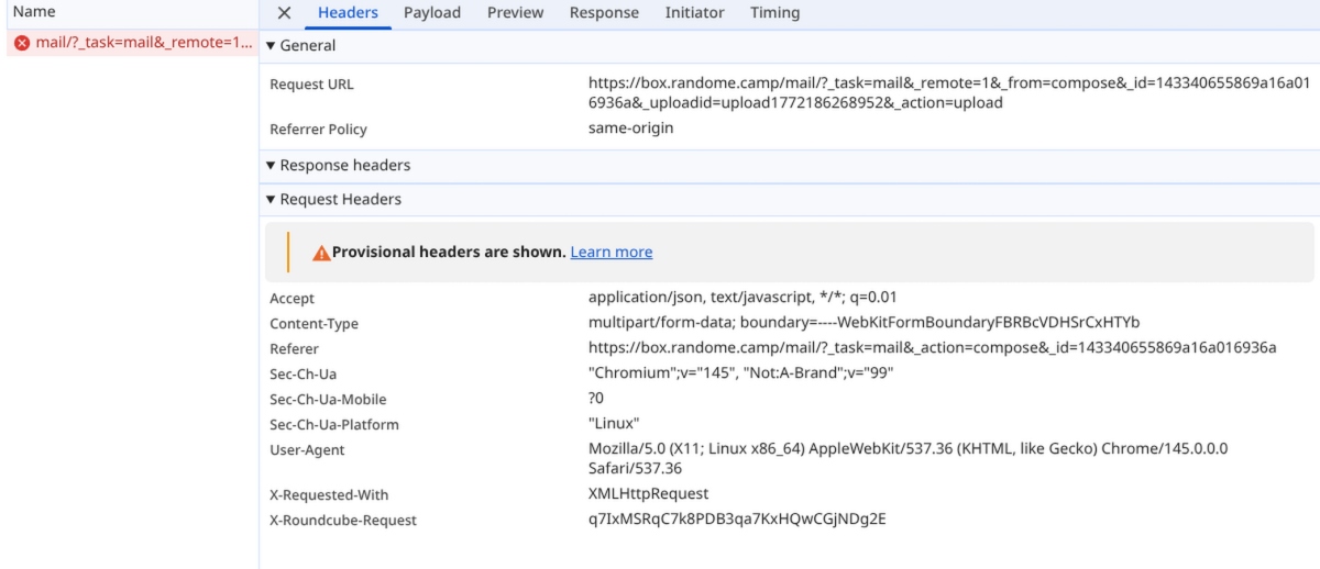 ?_task=mail&_action=uploadrequest → status (failed) / code 0 (no server response). -