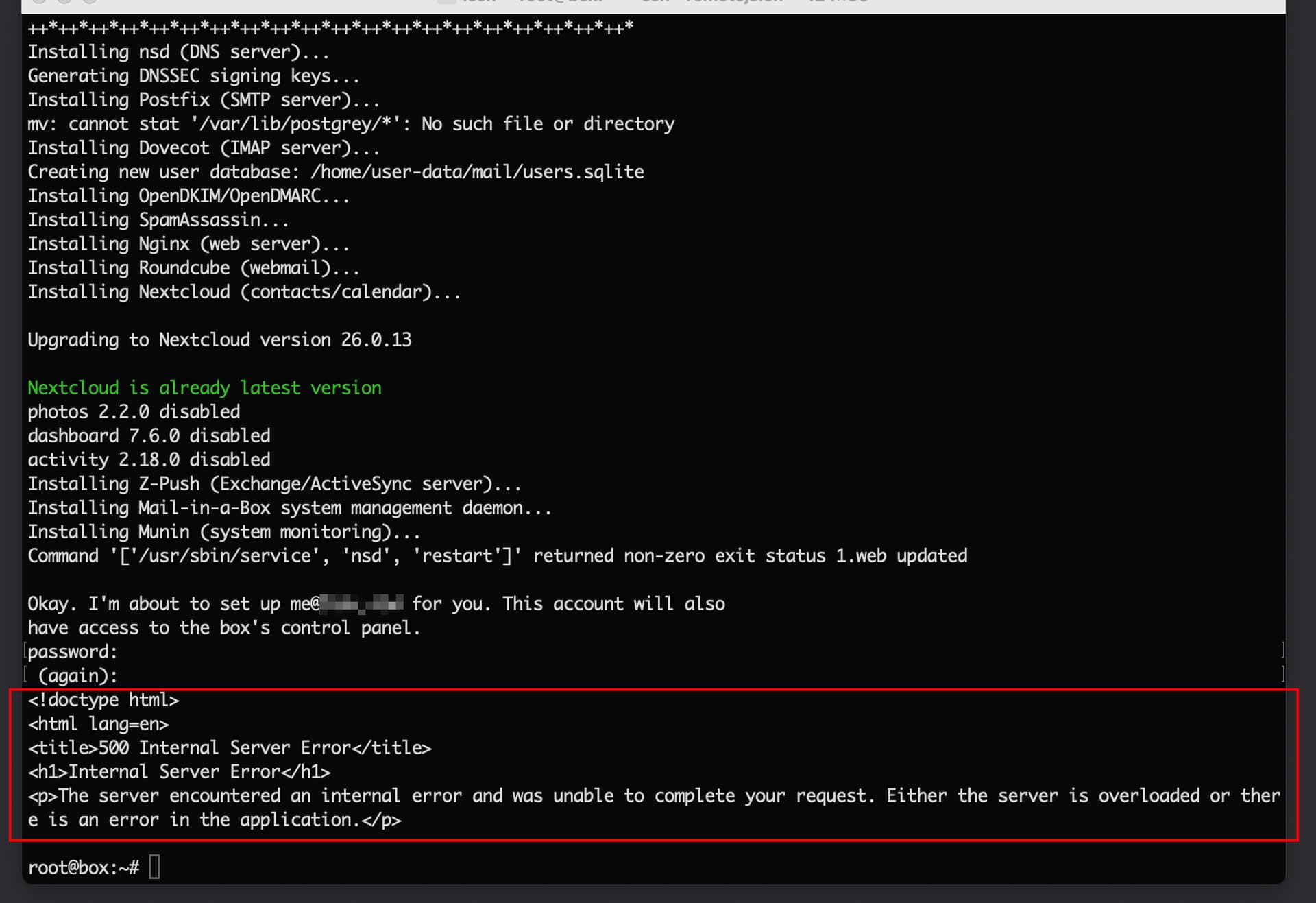 I’m on a fresh Ubuntu 22.04 machine by racknerd and I keep getting this HTTP 500 error after entering my password the 2nd time. It would not be an issue except that the install script terminated and is incomplete, no idea exactly what is missing, but the an admin user account is definitely 1 of them