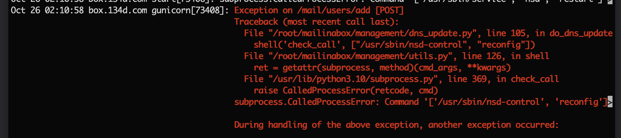 Do you want to start from scratch? Then it’s easy, rebuild the VPS image and try to install Mail-in-a-Box. You’ll encounter an error, and we’ll look at sudo journalctl -u nsd to see what it reports.
